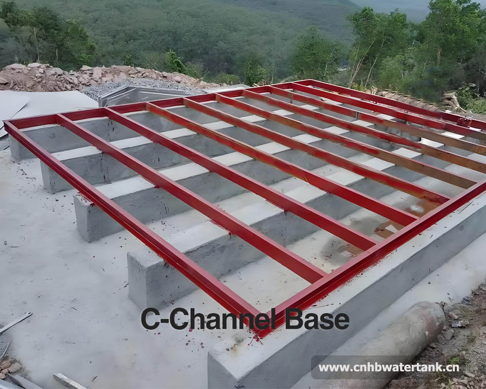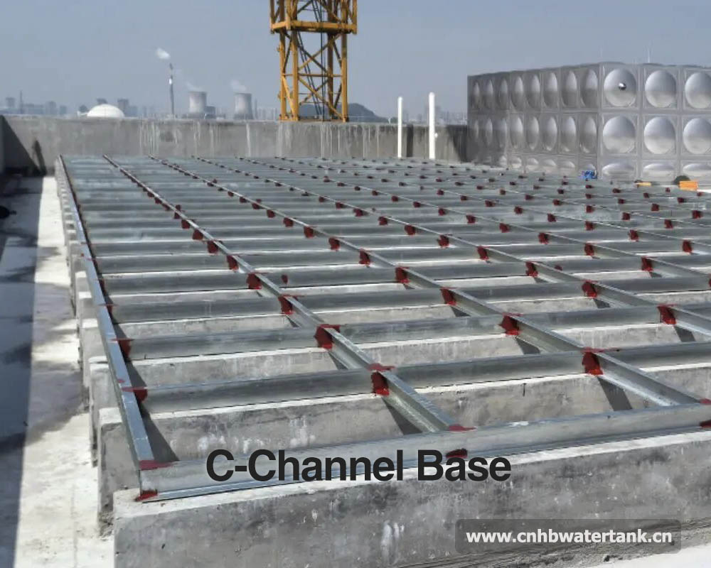 A C-Channel base is a prefabricated or site-assembled structural frame constructed from C-shaped steel sections (resembling a squared-off “C” in cross-section). This frame creates a rigid platform upon which the water tank sits,It provides a stable, level, and durable foundation that distributes the tank’s immense weight evenly to the ground below, preventing settlement, cracking, and catastrophic failure.