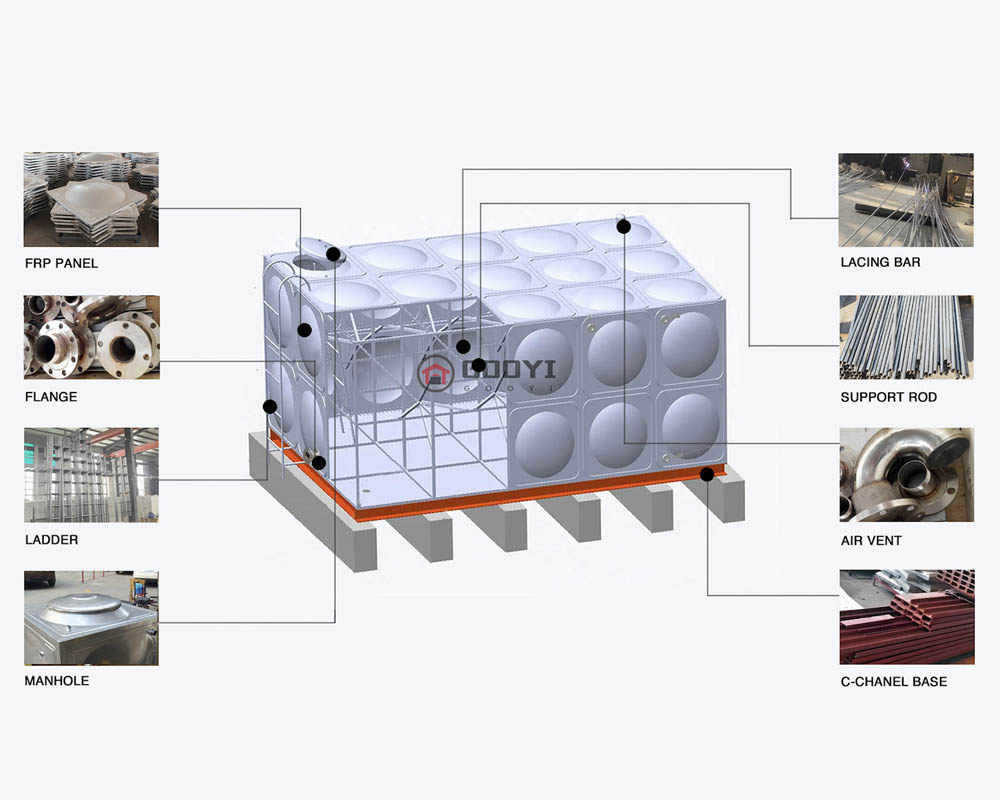 Stainless steel water storage tank constructed by assembling standard-sized SMC molded panels such as:1500×500 mm / 1000×1000 mm / 1000×500 mm / 500×500 mm, The length, width, and height dimensions of the water tank should be selected as multiples based on 500mm. for the panel shape design, we provide 2 options, round type and X type.